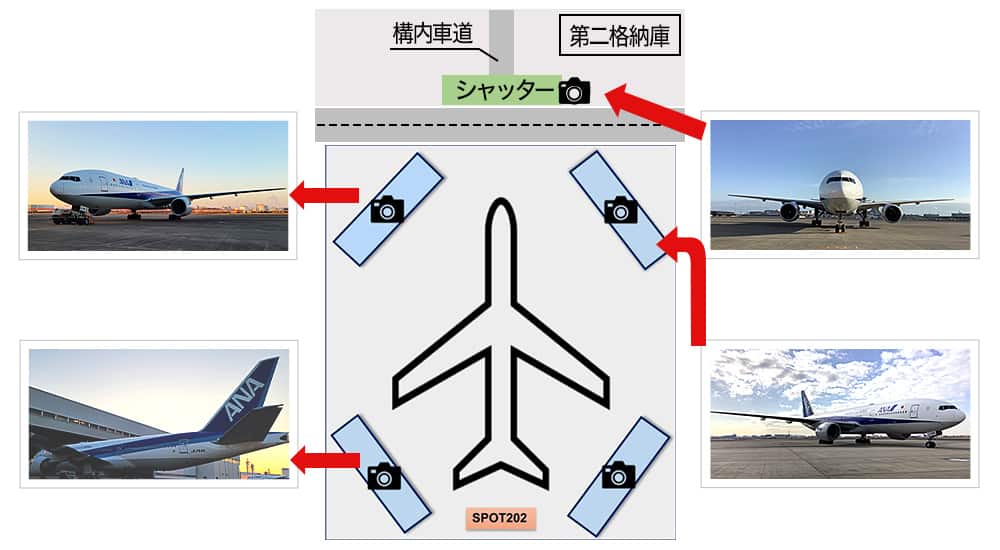 複数の撮影アングルを設定!5カ所のポイントでの撮影時間をそれぞれ設けています。背後の滑走路から離発着する機体と絡めた撮影も可能です。