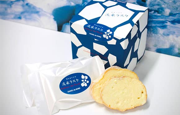 地元民から愛されているパン・菓子店ダニエル・ドゥ・ノウが販売する「流氷ラスク」。アムール川河口付近で誕生する流氷をイメージした手作りラスクは、網走産の小麦を使ったサクサクのラスクに、ホワイトチョコレートをコーティングした一品。常温で持ち帰ることができます。
