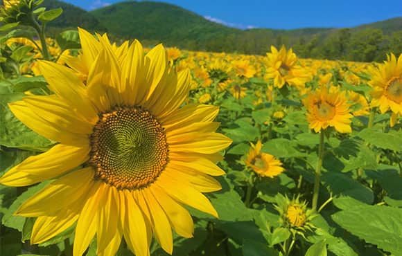 網走刑務所の旧農場跡地を整備した、全体で80ヘクタールの広さがある観光農園です。大曲湖畔園地では、ひまわり畑の2期作が行われ、1回目は7月中旬から下旬にかけて、約150万本のひまわりが見ごろを迎えます。2回目は9月中旬から下旬にかけて、約18ヘクタール(東京ドーム約4個分)という広大な敷地内に約260万本のひまわりが花を咲かせます。ひまわり畑の中を秋風を感じながら散策できるほか、コスモス畑も見ごろを迎えるので、二つの花畑を同時に楽しめるのも魅力です。