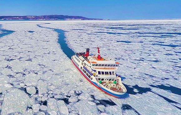 流氷はオホーツク海北部の沿岸で誕生し、風や海流に流されながら成長を繰り返し北海道・道東の沿岸にたどり着きます。海が一面真っ白に覆われる貴重な景色を見ることができる日もあれば、気象状況によって流氷がはるか遠くに流されることもあり、どんな出会いになるかは当日までのお楽しみ!「おーろら」に乗ってその迫力と感動をより近くで体験できます。