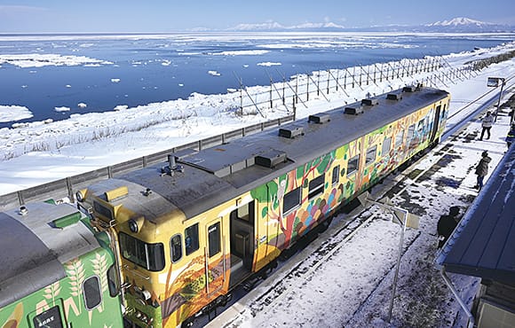 JR釧網本線の「流氷物語号」は、流氷が到来するオホーツク海沿い網走駅から知床斜里駅間を疾走する冬季限定の大人気観光列車。
