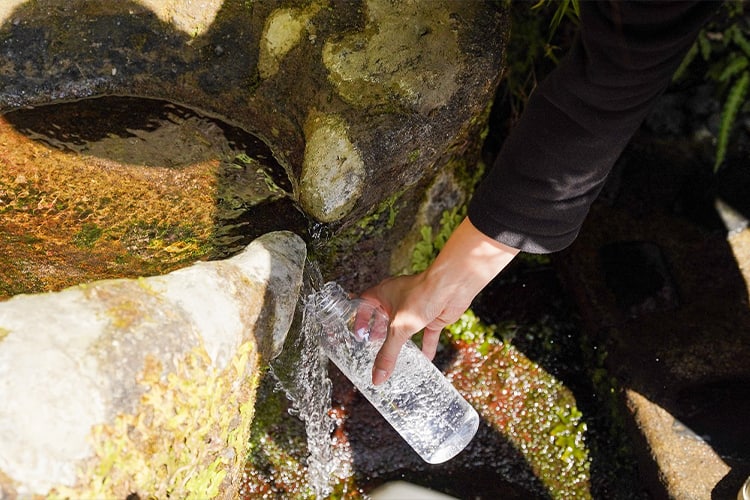 汲んだ水を専用容器にボトリング。その後は公園の好きな場所を選んで、お手製キャンプ用品で湧水を沸かし、知覧茶などを淹れていただきます。近接するカフェ「サクラノヤカタ」で提供するスイーツもご一緒にどうぞ。