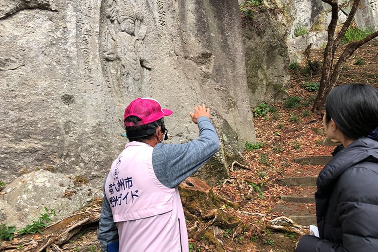 川辺地域には仏教にまつわる史跡が数多く見られます。万之瀬川沿いに高さ20m、幅400mにわたって刻まれた約200基の清水磨崖仏群を、ベテランのガイドが丁寧に分かりやすくご案内します。なんでも質問してください。