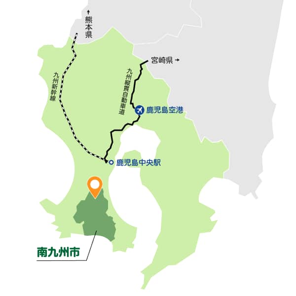 鹿児島空港→ 車で約1時間(九州自動車道経由)