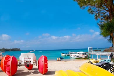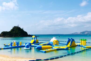 • かりゆしビーチのかりゆしウォーターランドは約40メートル四方のビーチアスレチックで、トランポリン、滑り台、シーソー、ロッククライミング、ジャングルウォークなど約20種類のエアー遊具が連なり、4歳のお子様から大人までご家族でお楽しみいただけます。