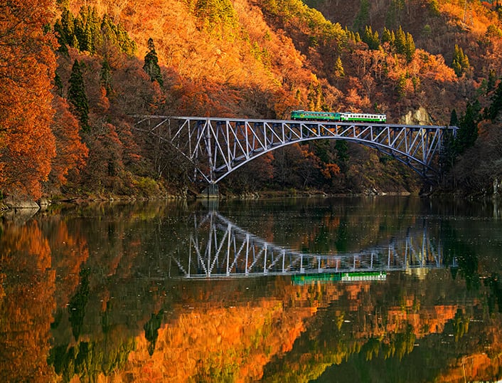 福島県会津若松市から新潟県魚沼市を結ぶ只見線は、全国紙の「紅葉の美しい鉄道路線ベストテン」で第1位に選ばれたこともある全国屈指の秘境路線です。第一只見川橋梁を代表としたフォトジェニックスポットのみならず、沿線を流れる只見川や雄大な山々が織りなす四季折々の風景は、国内外から訪れる人々を魅了してやみません。