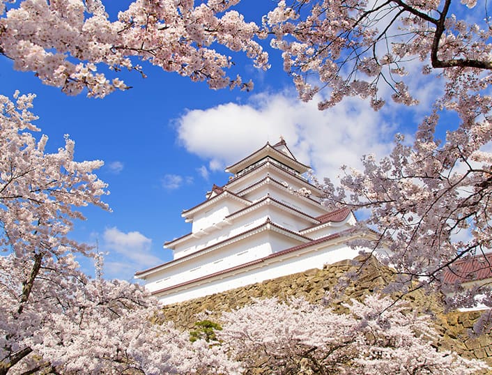 会津若松市のシンボルである鶴ヶ城は、難攻不落の名城として有名で赤瓦の天守閣はとても美しく、日本百名城に数えられています。公園内ではソメイヨシノを中心にシダレザクラ・ヤマザクラなど約1,000本が咲き乱れ、開花期間中のライトアップでは夜桜見物も楽しめます。天守閣最上部の展望フロアからは会津の街並みを一望できます。