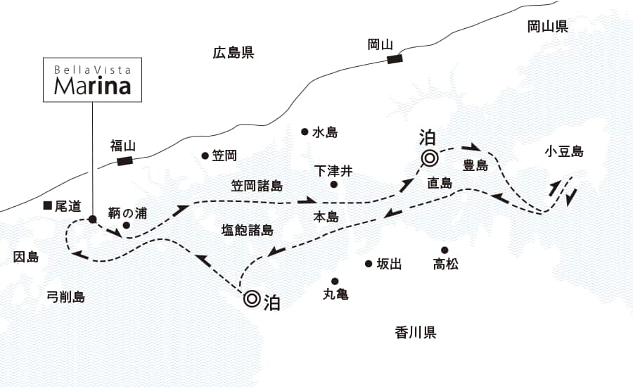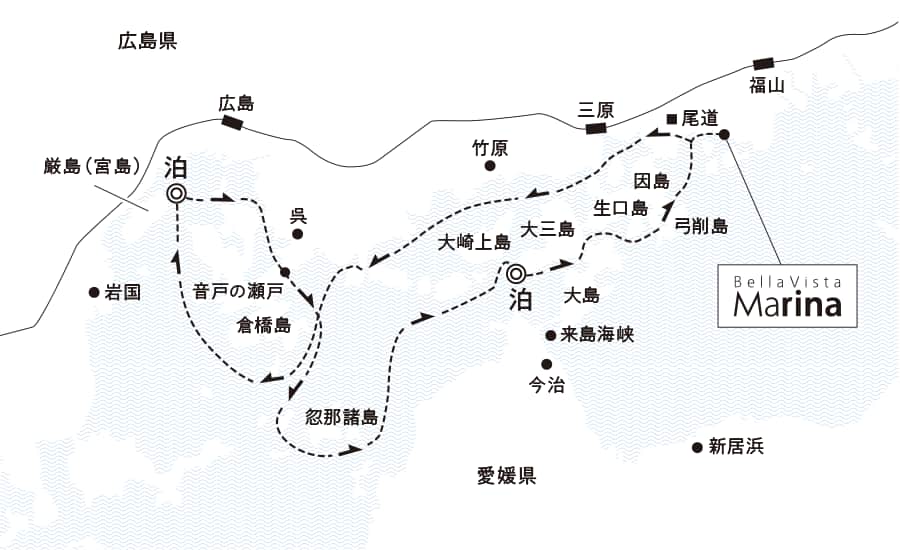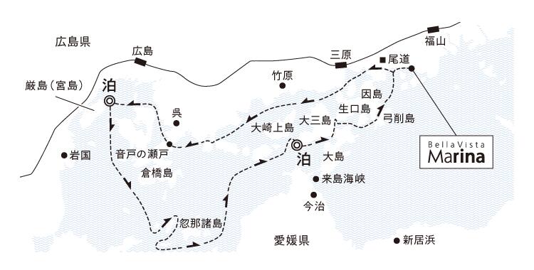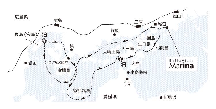 ベラビスタマリーナ出港(15:00頃) ==〔 尾道水道 〕==〔 三原瀬戸 〕==〔 契島 〕== |