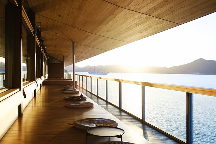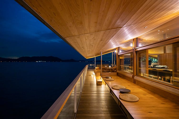 客船には珍しい縁側。点在する島々や、船が行き交うせとうちの日常の光景に浸りながら、昼はぜんざいなどの季節の甘味を、夜は料理長おすすめの肴を。その時季にぴったりの縁側のメニューをお楽しみください。
