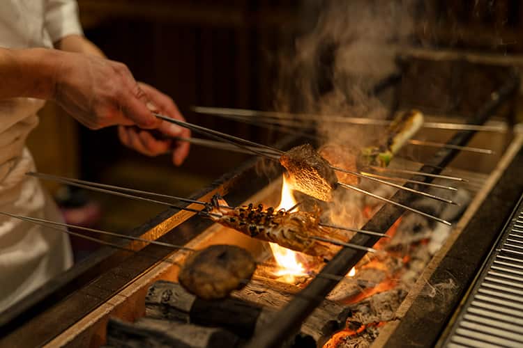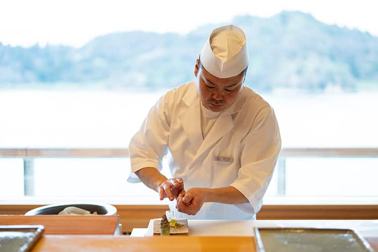 海を眺められるわずか6席の鮨カウンター。地元の海でとれた旬の魚介を中心に、淡路島 「亙(のぶ)」の坂本亙生氏監修のせとうちならではの鮨が並びます。とれる海域や季節によって異なる白身魚の、繊細さ、奥深さをご堪能ください。