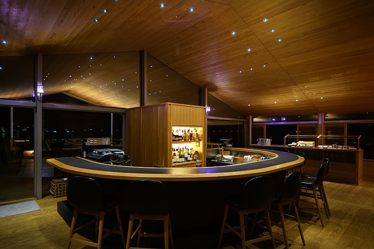 船首側の景色を臨む、U字のバーカウンター。オリジナルブレンドコーヒーや柑橘のフレッシュジュース、瀬戸内海の島々をイメージして創作したカクテルや地元の日本酒など、昼夜問わずアルコールもお楽しみいただけます。