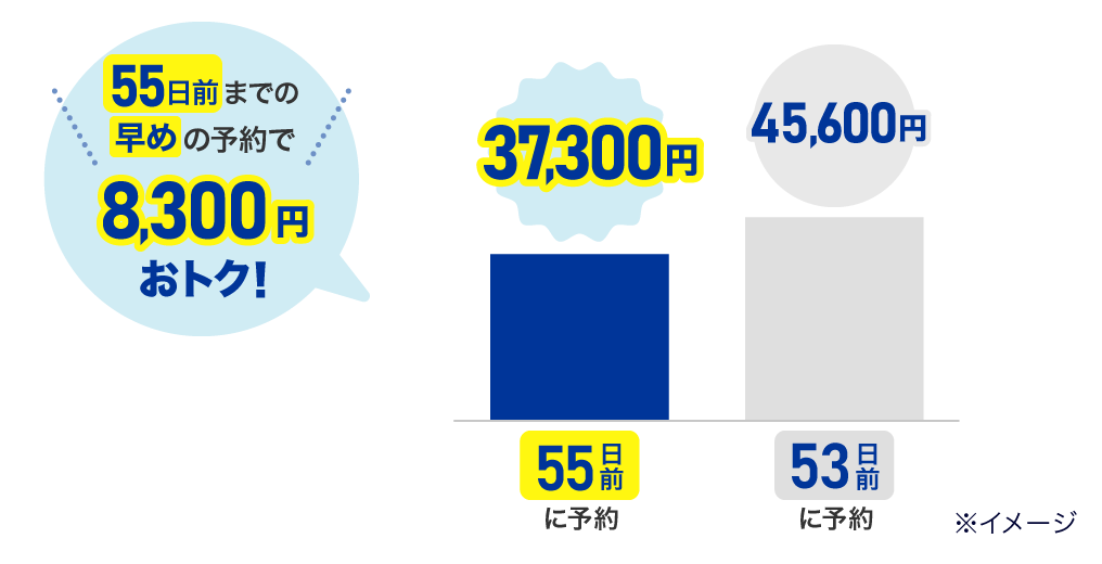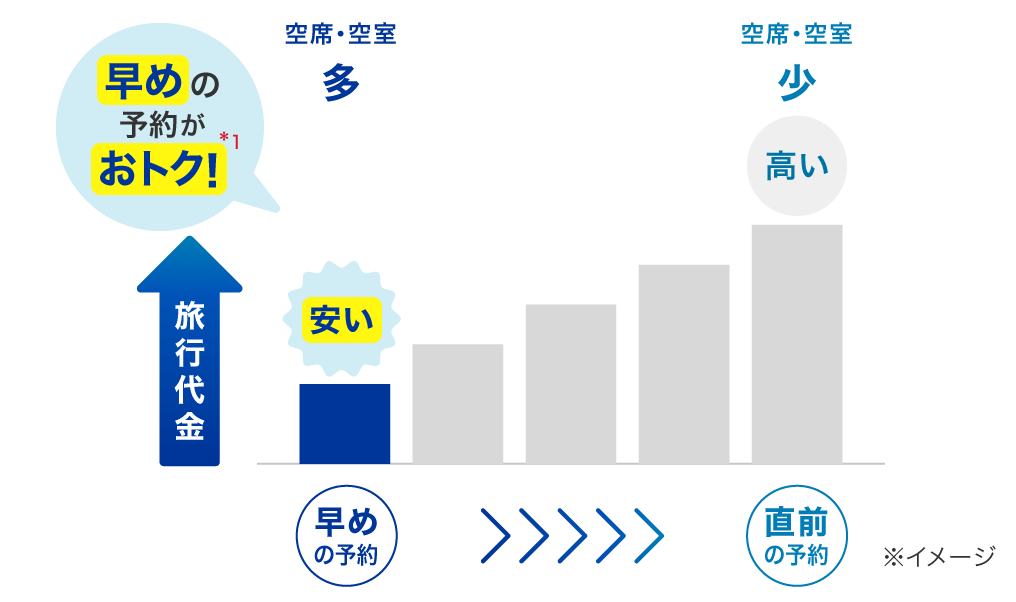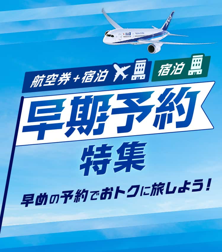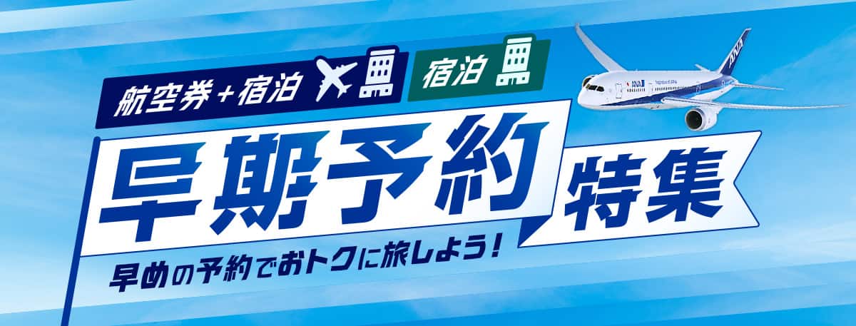 航空券+宿泊(ダイナミックパッケージ)も宿泊のみも、航空便の空席・宿泊施設の空室が比較的豊富な早めの予約がおすすめです。