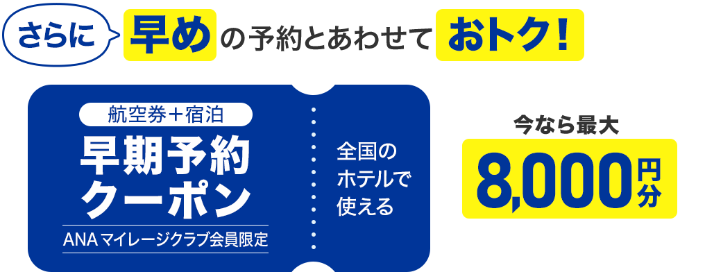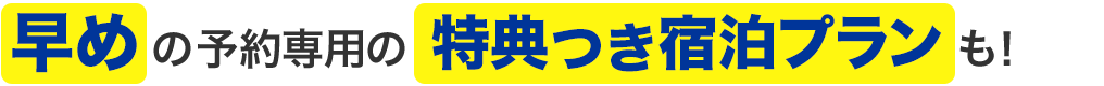 2カ月以上先のご予約でおトクになる宿泊プランや早期予約限定のクーポンもご用意しております。