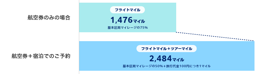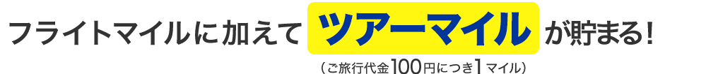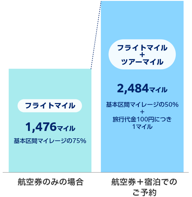 航空券+宿泊(ダイナミックパッケージ)でのご予約の場合、区間基本マイレージに対する積算率50%のフライトマイルに加えて、旅行代金100円につき1マイルのツアーマイルも貯まります。宿泊のみのご予約でも、宿泊代金100円につき1マイル貯まります。航空券のみでのご予約よりも、より多くマイルを貯めることができます。