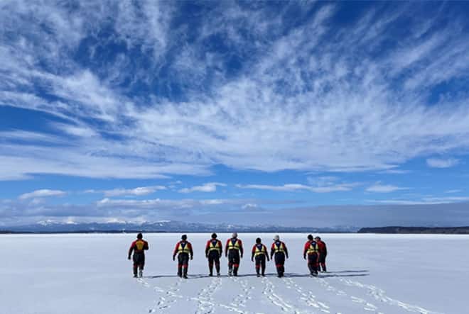 1月~2月にかけて、小川原湖は岸から100~200mの水面が厚い氷に覆われます。その氷の上を楽しむ期間限定の「アイスウォーク」体験です。ドライスーツを着用しての体験ですので、寒さも気になりません。氷の上を歩く感覚は、ドキドキ感がいっぱいです。寒いからこそできる冬の小川原湖限定のプログラムです!