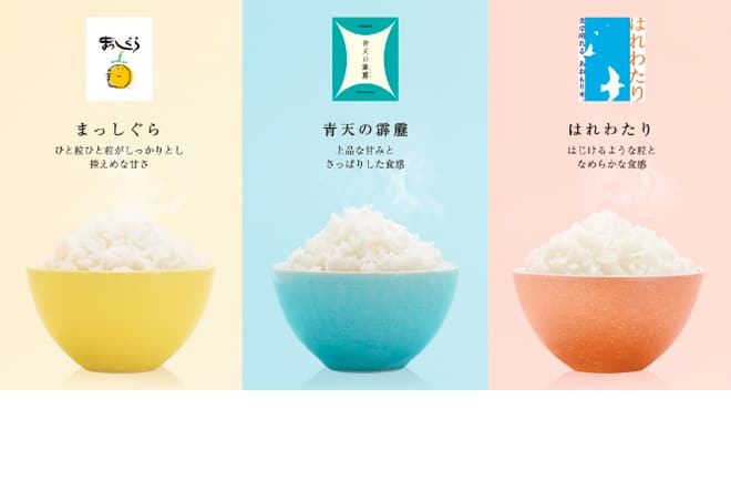 上品な甘みとさっぱりとした食感で食べたらすぐに違いがわかる、ブランド米「青天の霹靂」を筆頭に、ふっくら優しい食感と毎日食べたくなるほどよい甘みが特徴の「はれわたり」、ひと粒ひと粒がしっかりと控えめな甘さの「まっしぐら」と、あおもり米には3種類の美味しさがあります。