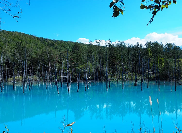 水面が青く見える不思議な池。季節や天候によって様々な青い色が楽しめます。雪融け水が多く流れ込む春は、少しグリーンブルー(緑色)に、初夏は新緑と池のブルーの対比が楽しめるほか、ライトブルーに見える日も多くあります。秋の紅葉に彩られた水面もまた違う見え方となり、真冬は池が凍結し、一面白い世界に。冬はライトアップを実施しています。