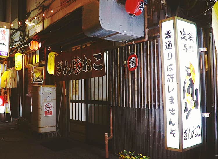 渋い酒場が並ぶ「ふらりーと」にお店を構えるぎんねこは1950年創業の老舗。「新子焼き」はもちろん、おすすめを7本味わえる「串のフルコース」や豚の肩ロースを炭火で焼いてタレを絡めた「ちゃっぷ焼き」などお酒が進む料理がズラリ。地酒を直接ガス火で温める「鳩燗」でいただくのもぎんねこスタイルです。