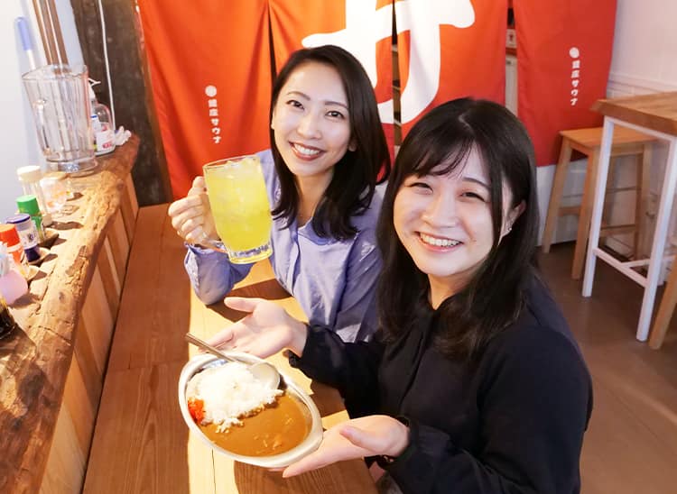 サウナの後は食事も!「ギンサカレー(銀座サウナカレーの略)」はおでんの出汁が効いて絶品。水分補給にはオロナミンCとポカリを合わせた「オロポ」を飲むのがサウナ通の流儀です。