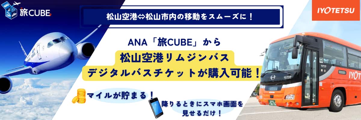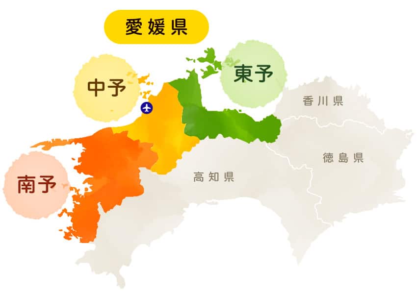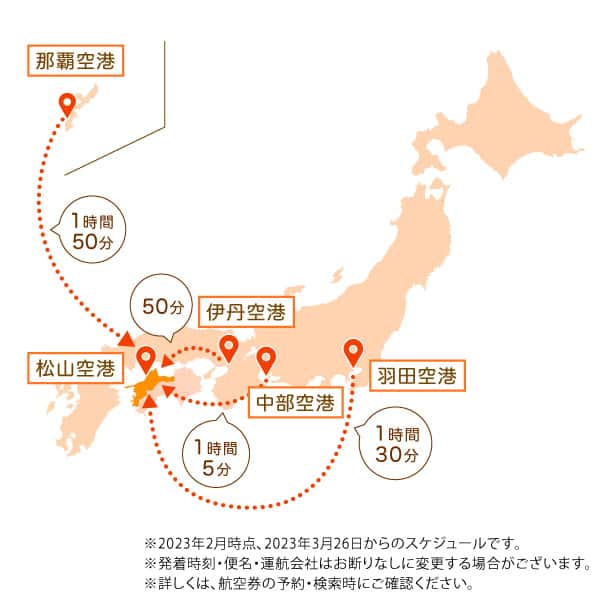 県のほぼ中央に位置する松山へは、東京から飛行機で1時間30分、大阪からは50分です。中部空港から飛行機で1時間5分、那覇空港からは1時間50分です。