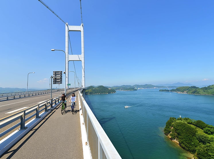 愛媛県今治市と広島県をつなぐ日本で初めて自転車で海峡を渡れるしまなみ海道は、サイクリングに人気の観光スポットです。瀬戸内海に浮かぶ島々の絶景を楽しみながらのんびりサイクリングはいかがでしょうか。