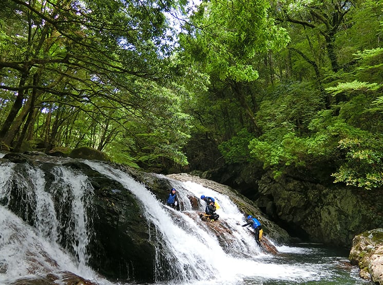 渓流で岩肌を滑り降りたり滝壺に飛び込んだり、究極の川遊びが楽しめるキャニオニング。松野町にある滑床渓谷には天然のスライダーが多数存在し、岩肌をロープで下るラッペリングや、滝壺へのダイビングなど、文字通り“川を遊び尽くす”体験ができます。