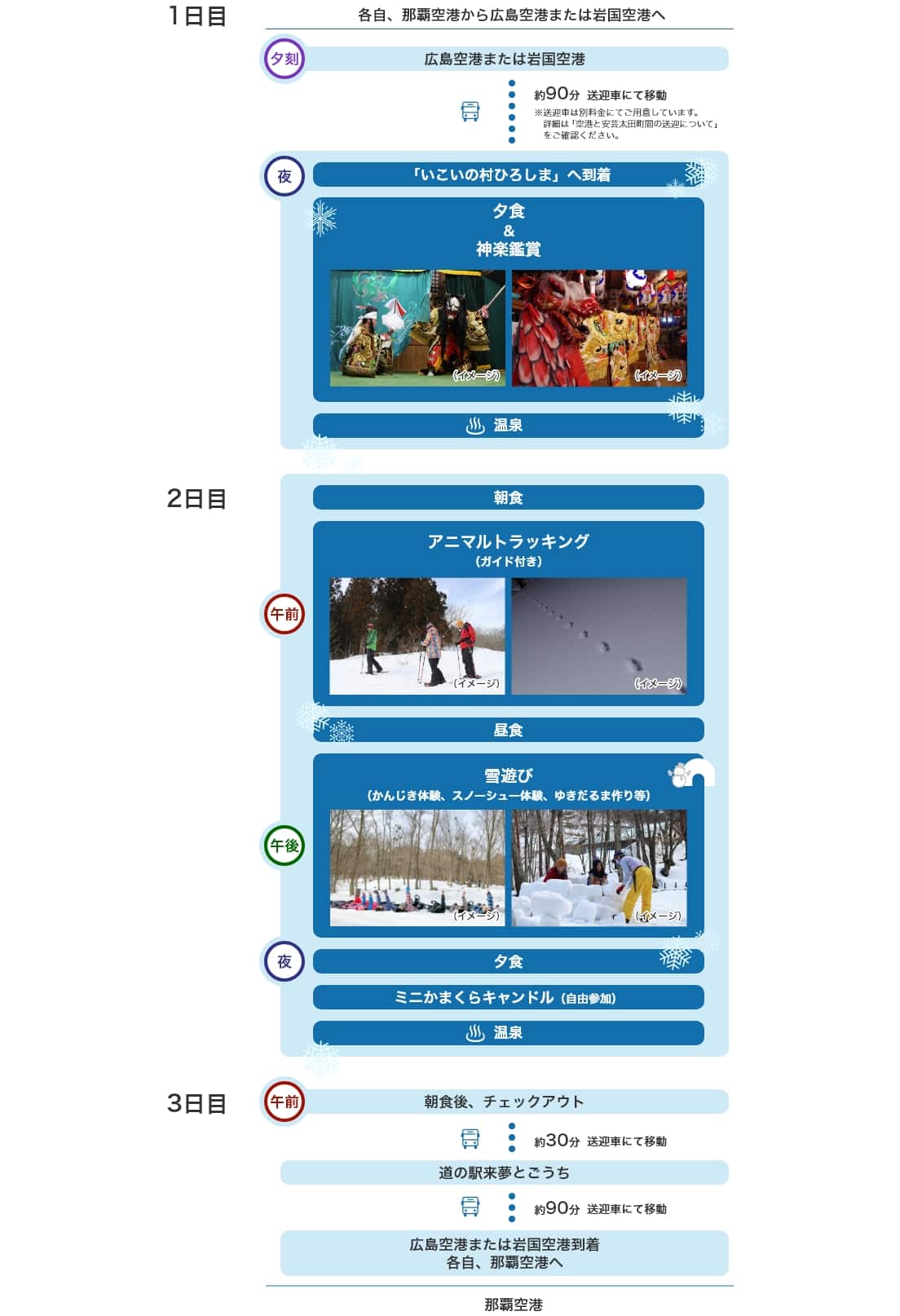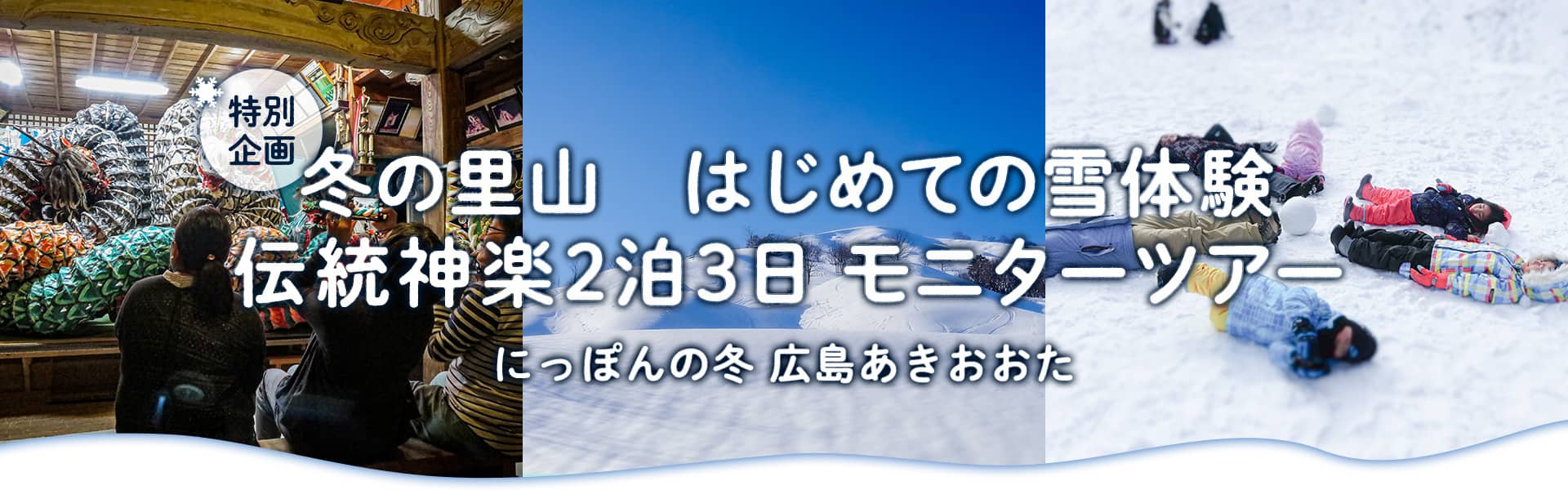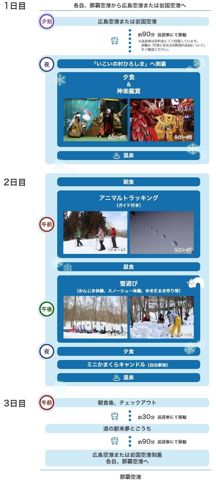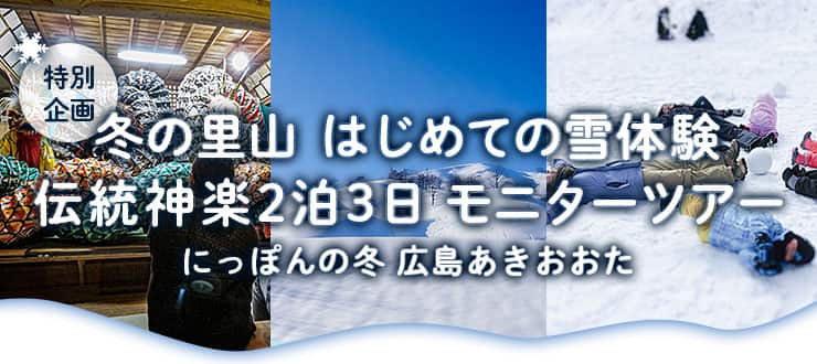 各出発日の予約ボタンより、往復の航空券ならびに宿泊プラン(冬の里山 はじめての雪体験・伝統神楽2泊3日モニターツアー付きプラン)をご予約ください。