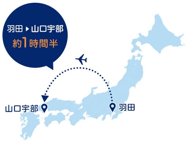 羽田空港から約1時間30分で山口宇部空港へ。宇部新川駅方面へは、空港連絡バスで約15分。
