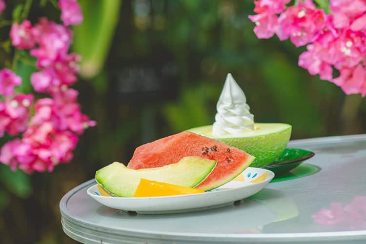 西島園芸団地は、マスクメロンやすいかなど多彩なフルーツ栽培と、一年中熱帯花が咲き誇るトロピカル空間が魅力の体験施設。園内にあるカフェでは、フルーツ満載のパンケーキや、完熟フルーツトマトを煮込んだ名物「フルーツトマトカレー」も味わえます。甘い香りに包まれながら、南国の恵みを存分にお楽しみください。