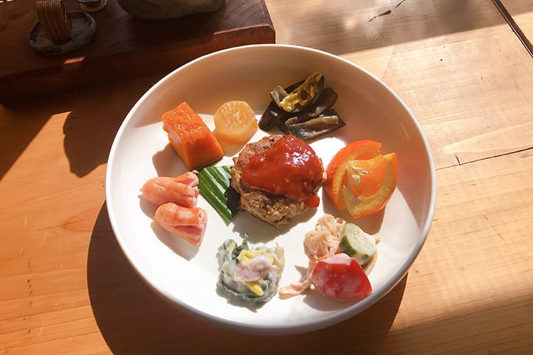 おばあちゃん家のような「おすそわけ食堂まど」。お子様連れでも気兼ねなく過ごせる温かい空間です。近隣農家さんから届く規格外などの「おすそわけ野菜」を使い、愛情込めた日替わり定食を提供。食品ロスを減らし、心と体に優しいお料理をお楽しみください。