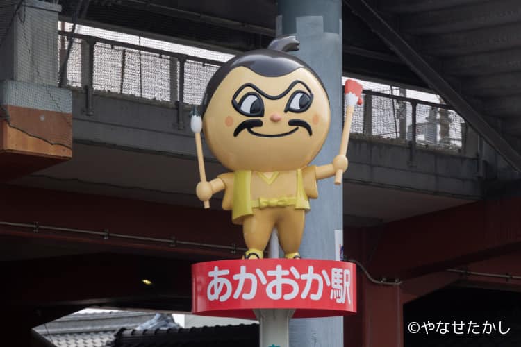 「ごめん・なはり線」の21駅の各駅には、やなせさんによって書かれたかわいいキャラクターがいます。あかおか駅の広場では、21体のキャラクターと、どろめ祭りの大漁くん・どろめちゃんが勢揃い!観光博に合わせてお色直しされキュートなりました。絵金をモデルにしたキャラクター「あかおかえきんさん」が目印!