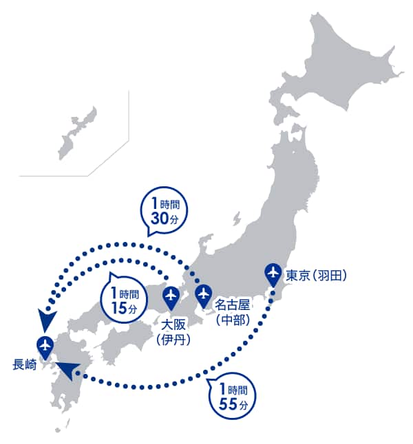 長崎空港へは、飛行機で東京(羽田)から約1時間55分、名古屋(中部)から約1時間30分、大阪(伊丹)から約1時間15分です。