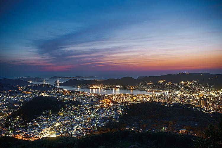 女神大橋の向こうの島々に落ちる夕日を眺めるなら鍋冠山。港を中心とした長崎市の全景を見渡すなら稲佐山。街の光を中心に、春には夜桜もいっしょに楽しめる風頭公園。