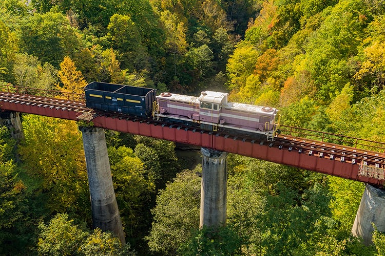 1945年(昭和20年)に竣工した三井鉱山専用鉄道の橋梁。貴重な産業遺産として国の登録有形文化財に指定され、橋の上には、懐かしいフォルムのディーゼル機関車DD501と、石炭専用貨車セキ3820を保存展示されています。