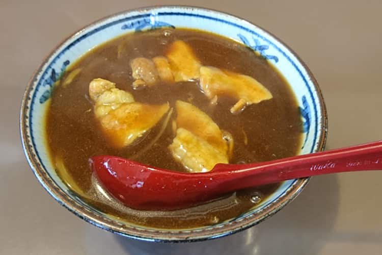 豚肉を使ったカレーそば。過酷な労働に従事する炭鉱マンに愛されたスタミナ食。なみなみ注がれる熱々つゆで夕張に来たら必ず食べたい一品。
