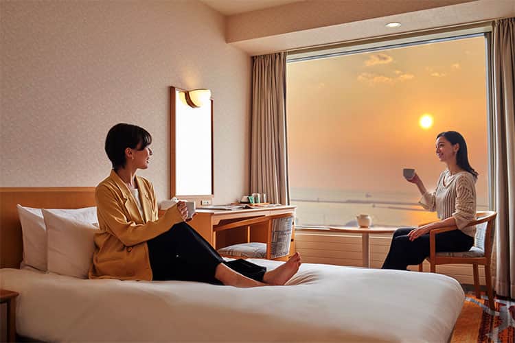 高層階ツインルームは、全室オーシャンビュー。景色をさえぎられることなく、太平洋や世界三大夕日といわれる釧路の夕日をご覧いただけます。