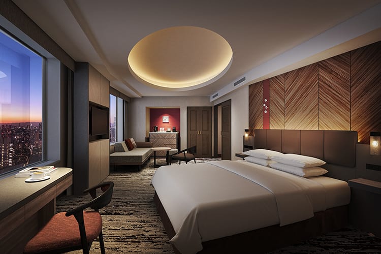マジックアワーの空色、ブルーのグラデーションがキーカラーのクラブラウンジと、木・革・蝦夷和紙など自然の質感を活かした客室が織りなす上質な空間。宿泊者専用クラブラウンジ特典付き。