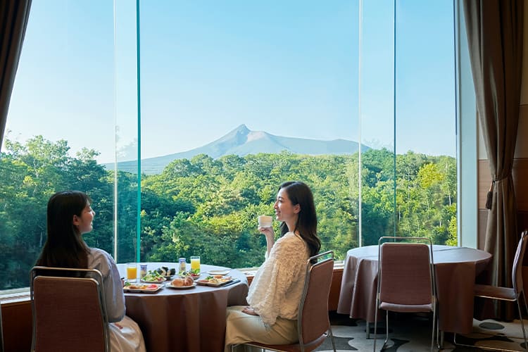 北海道ならではの地元食材を揃えた朝食ブッフェ。北海道の自然と駒ケ岳を望めます。その場で握ってもらえる手作りおにぎりも人気です。