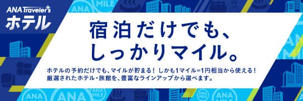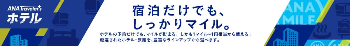 | 対象サービス | ANAトラベラーズ ホテル * 国内ホテルに限ります。 * 航空券のみ、ANAトラベラーズ ダイナミックパッケージ(航空券+宿泊)、レンタカー、 アクティビティのみのご予約にはご利用いただけません。 |