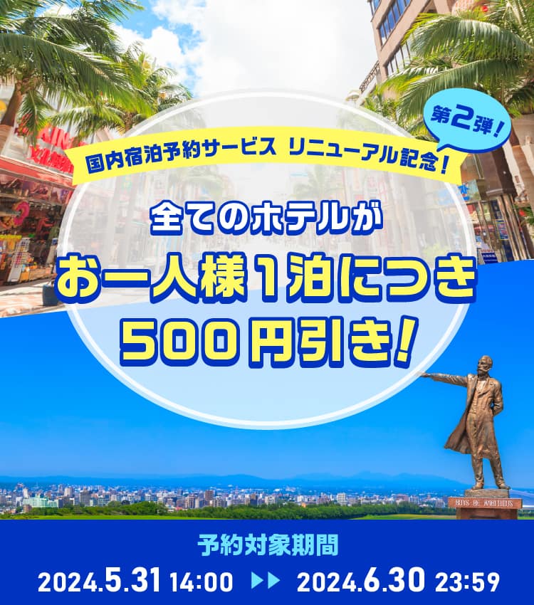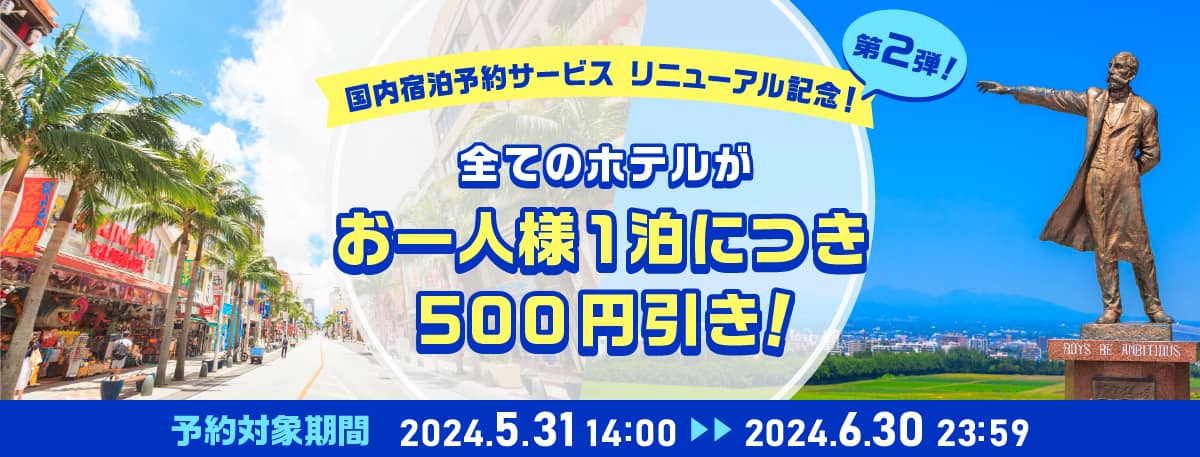 【C】国内宿泊予約サービスリニューアルキャンペーン第2弾 今ならお一人様1泊500円引き!