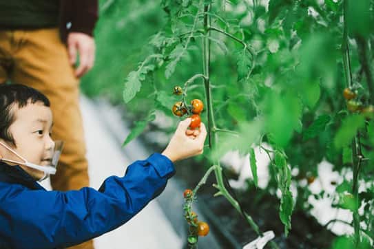 施設スタッフの説明を受けながら、採れたての「校庭トマト」をその場でパクリ。甘さと酸味が互いに引き立った味わいに、大人も子どもも笑みがこぼれます。アグリミュージアムNADAの屋上にはソーラーパネルが設置されており、蓄えられた太陽エネルギーで「教室バジル」に赤外線を照射して育てています。