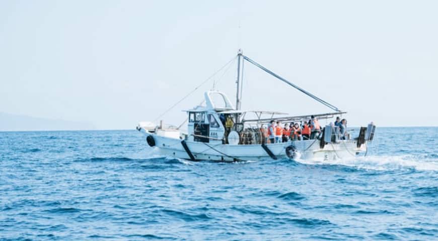2日目は、南あわじ市の土生(はぶ)港から南へ4600メートルほどの場所に浮かぶ「沼島」へ。島の周囲は10キロメートルほどで「神々が創った最初の島」と呼ばれています。沼島の観光ガイドの案内を受け、さっそく底引き網漁体験へ。