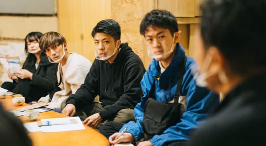 夕食後のトークセッションで、真剣に耳を傾ける参加者の皆さん。登壇者は、淡路島で有機玉ねぎを中心とした卸売業を営む新家青果の代表・新家春輝さんと、アグリミュージアムNADAの代表・菊川健一さん。2者が連携して取り組むB品玉ねぎの加工商品や6次産業化、SDGs思考の観光マーケティングのお話を聞いて、持続可能な地域活性化に必要な経営視野の広さを感じ取っていました。