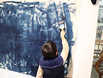 染色体験皆様が描いた模様がtamaki niime のウェアになる!藍染の染料を使って生地に自由に線や絵・模様を描いてもらいます。染色をより身近に感じていただき、その生地を使ってウェアを作成し、作品として販売を予定しています。