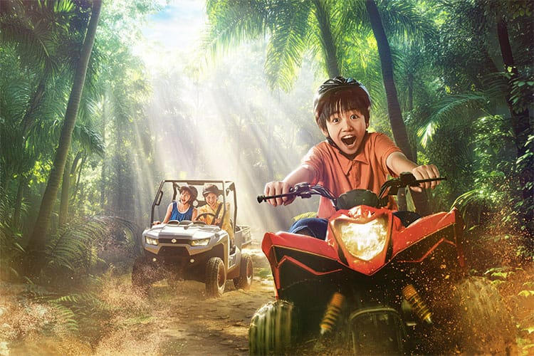 本格四輪バギーにまたがり、子供から大人まで楽しめるジャングルの大自然コースへ。視界いっぱいに熱帯の豊かな緑が生い茂り、南国の爽やかな風の音と軽快なエンジン音が心地よく混じり合う。子供でも運転できるから、思い切ってチャレンジしよう!ハンドルを握り、沖縄の空の下を走り回る、ここだけの特別な体験。