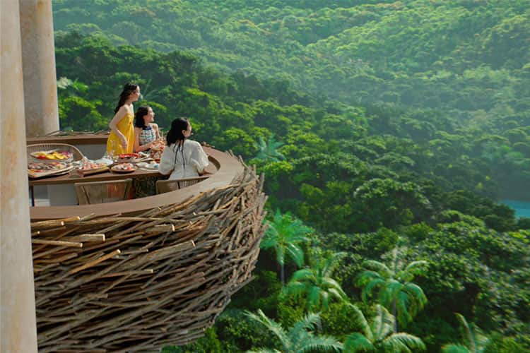 高い天井まで続く全面ガラスからは、濃く輝くやんばるの壮大な緑と、果てしなく広がる青空のパノラマ。刻々と変化していく景色は、目を向ける度に感動を与えてくれる。空と雲と太陽が描く夕暮れのグラデーション。南国の夜空を彩る圧倒的な花火。スタイリッシュな空間で味わう、沖縄県産の食材をふんだんに使った美食の数々も、贅沢な景色の一部。さらに、空中に浮かぶようなネスト席からは、パークを一望する別格の絶景。大自然に包まれるような優雅な時間を堪能できます。