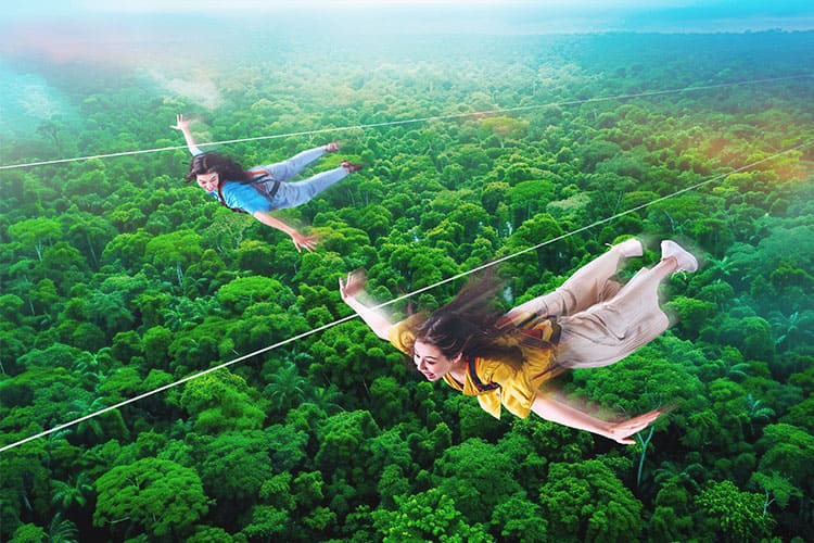 翼のように大きく手を広げたら、力強く羽ばたこう。眼下には、熱帯植物の緑が広がる圧倒的な大自然。果てしなく続く南国の空を、風を切りハイスピードで飛んでいけば、ココロもカラダもスカーッと爽快!自由な鳥の翼を得たまま、ジャングルの谷を越えていこう。