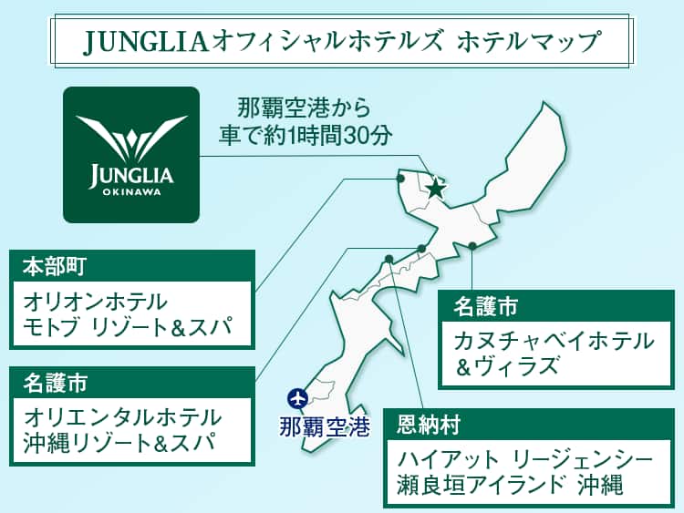 ホテルからJUNGLIA OKINAWAまでの所要時間は目安となり道路の混雑状況により変動します。あらかじめご了承ください。