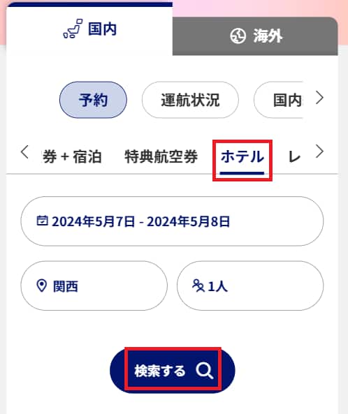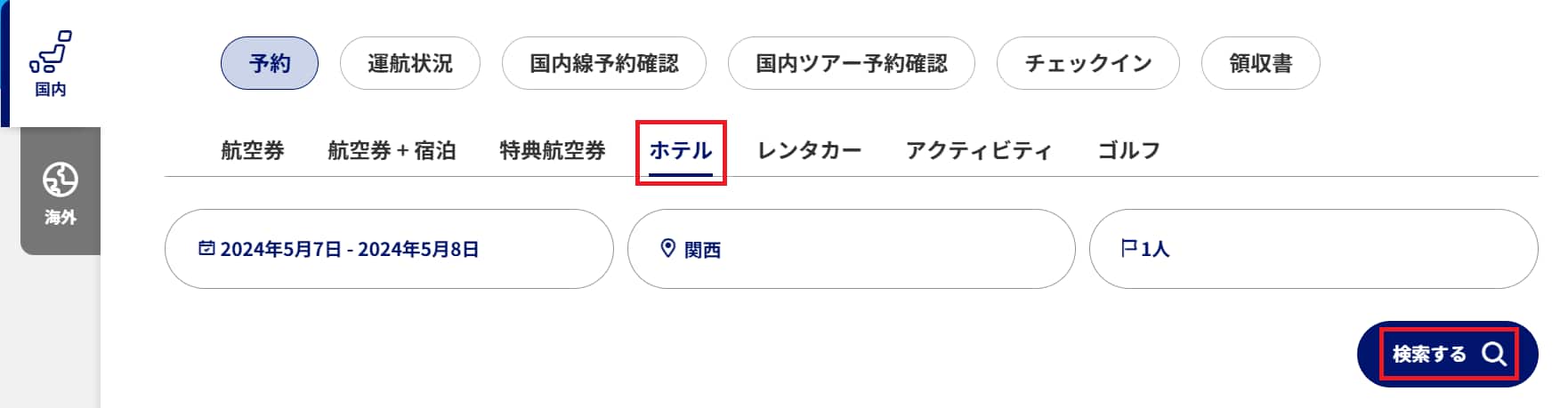 検索画面でご利用の日程、宿泊エリア、ご利用人数を入力し、条件に合う宿泊施設を検索。