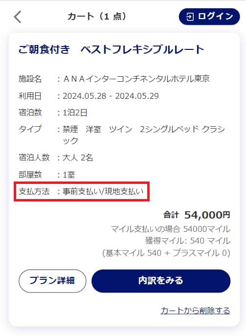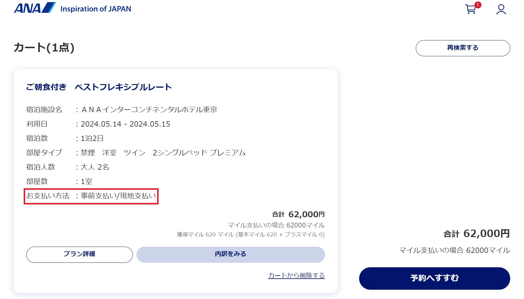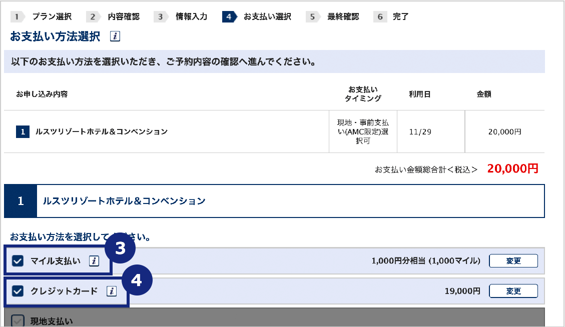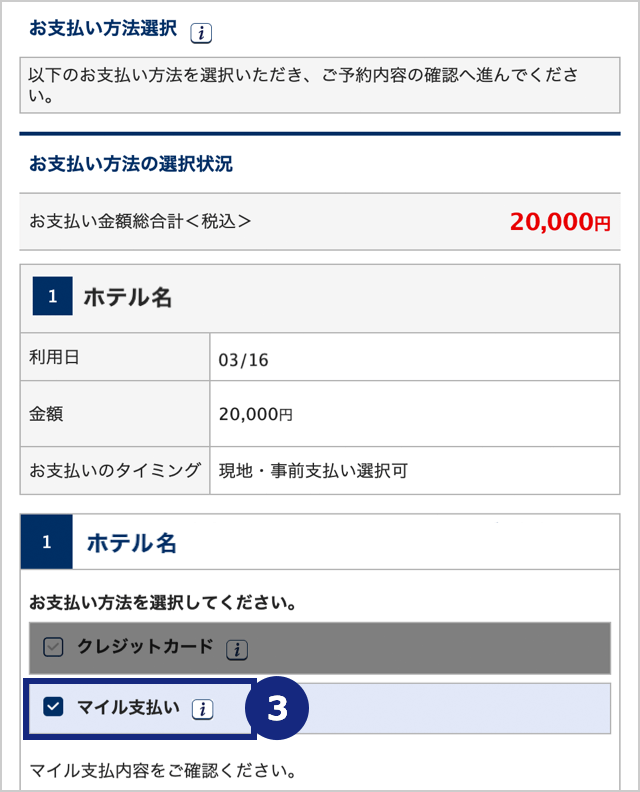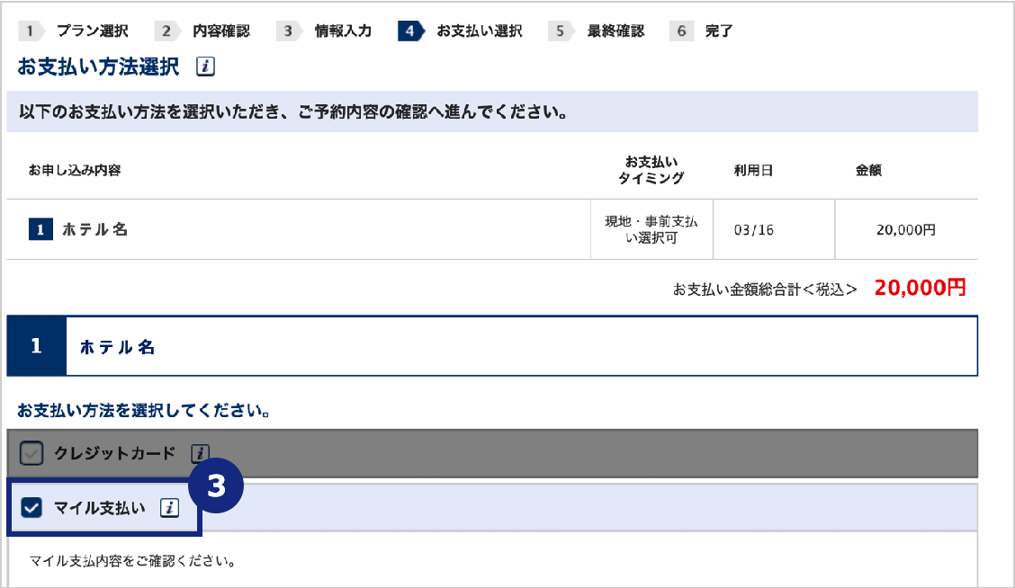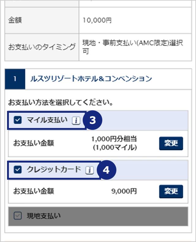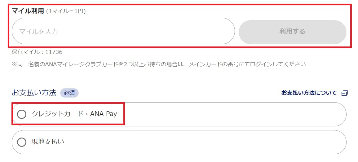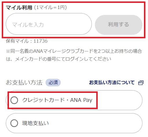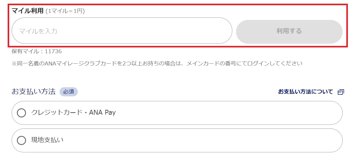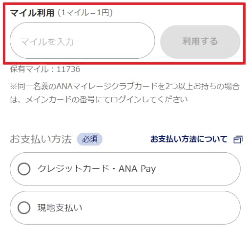 現地支払い限定プランの場合、マイルでのお支払いはできません。
